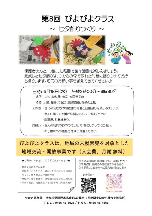 新型コロナウイルス感染症の影響により、7月4日(土)の夕涼み会は行事延期のため中止とします。また、7月8日(水)のぴよぴよクラスは7月29日(水)に振り替えます(内容は変更)。 |