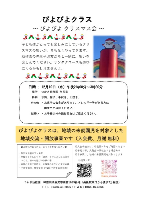 〇日時:12月10日(水)午後2時00分~3時30分 〇内容:「ぴよぴよクリスマス会」 〇場所:つかさ幼稚園年長室 〇持物:水筒、帽子、上履き ★クリスマスのイベントをお友だちや先生と一緒に楽しみましょう。 ★お菓子の会食がありますので、アレルギーをお持ちの方は園までご相談ください。 ★ぴよぴよクラスは4月2日時点で満2歳のお子様であれば、どなたでも参加可能な地域活動です。入会費等もありませんので、どうぞ、お気軽にご参加・お申込みください。 |