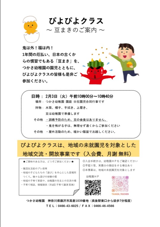 〇日時:2月3日(火) 午前10:00~10:40 〇内容:「豆まき」 ※在園児合同 〇場所:つかさ幼稚園 園庭 〇持物:水筒、帽子、上履き ★豆は園で用意します。なお、豆の会食は誤嚥予防のため、行いません。豆まきのみ行います。 ★屋外での活動です。暖かい服装でお越しください。 ★ぴよぴよクラスは4月2日時点で満2歳のお子様であれば、どなたでも参加可能な地域活動です。入会費等もありませんので、どうぞ、お気軽にご参加・お申込みください。 |